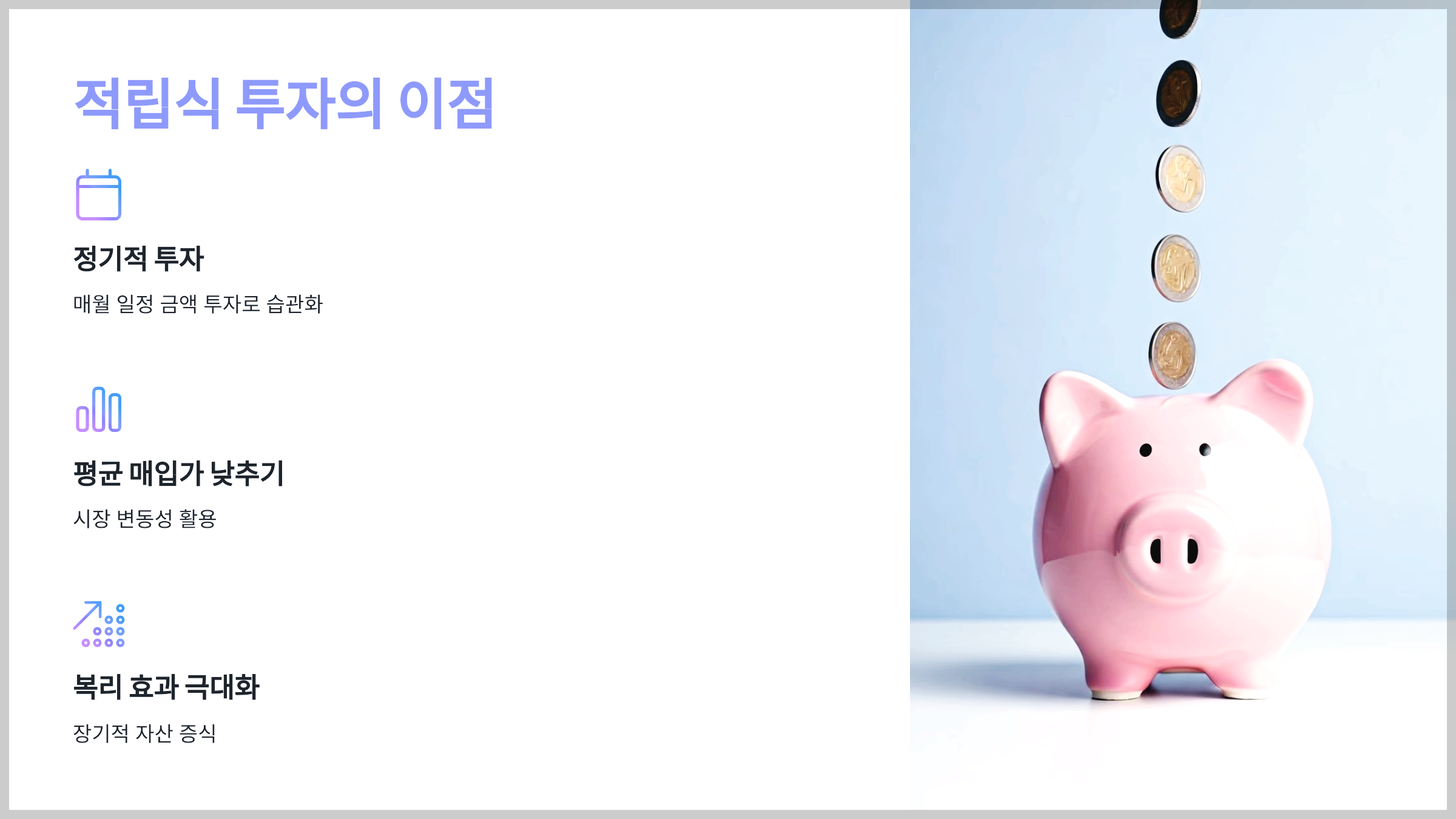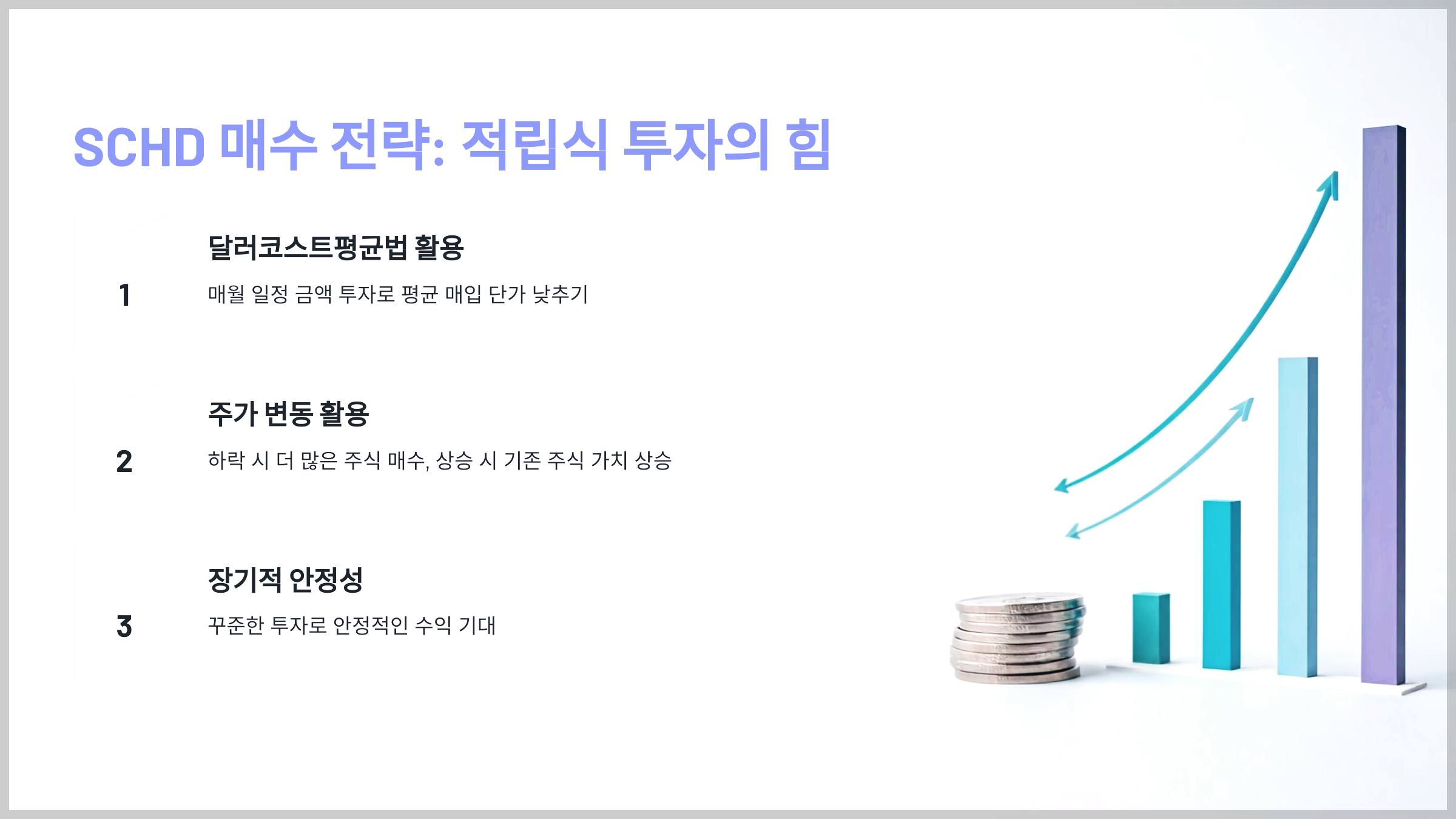 언제 SCHD를 매수해야 할까?라는 질문은 많은 투자자가 고민하는 부분입니다. 그러나 제 경험상 적립식 투자가 가장 효과적이었습니다. 매월 일정 금액을 투자하는 방식으로, 주가 변동과 상관없이 평균 매입 단가를 낮출 수 있었습니다. 주가가 하락할 때 더 많은 주식을 매수하고, 상승할 때는 기존에 매수한 주식의 가치가 상승하니 장기적으로 안정적인 수익을 기대할 수 있습니다.