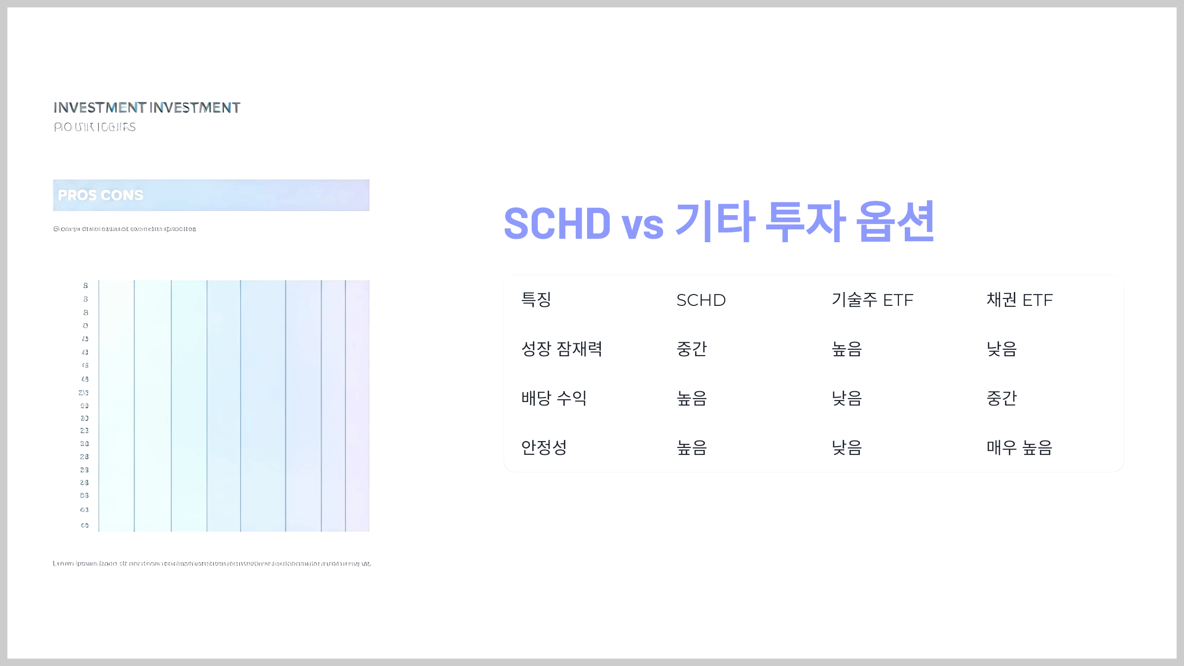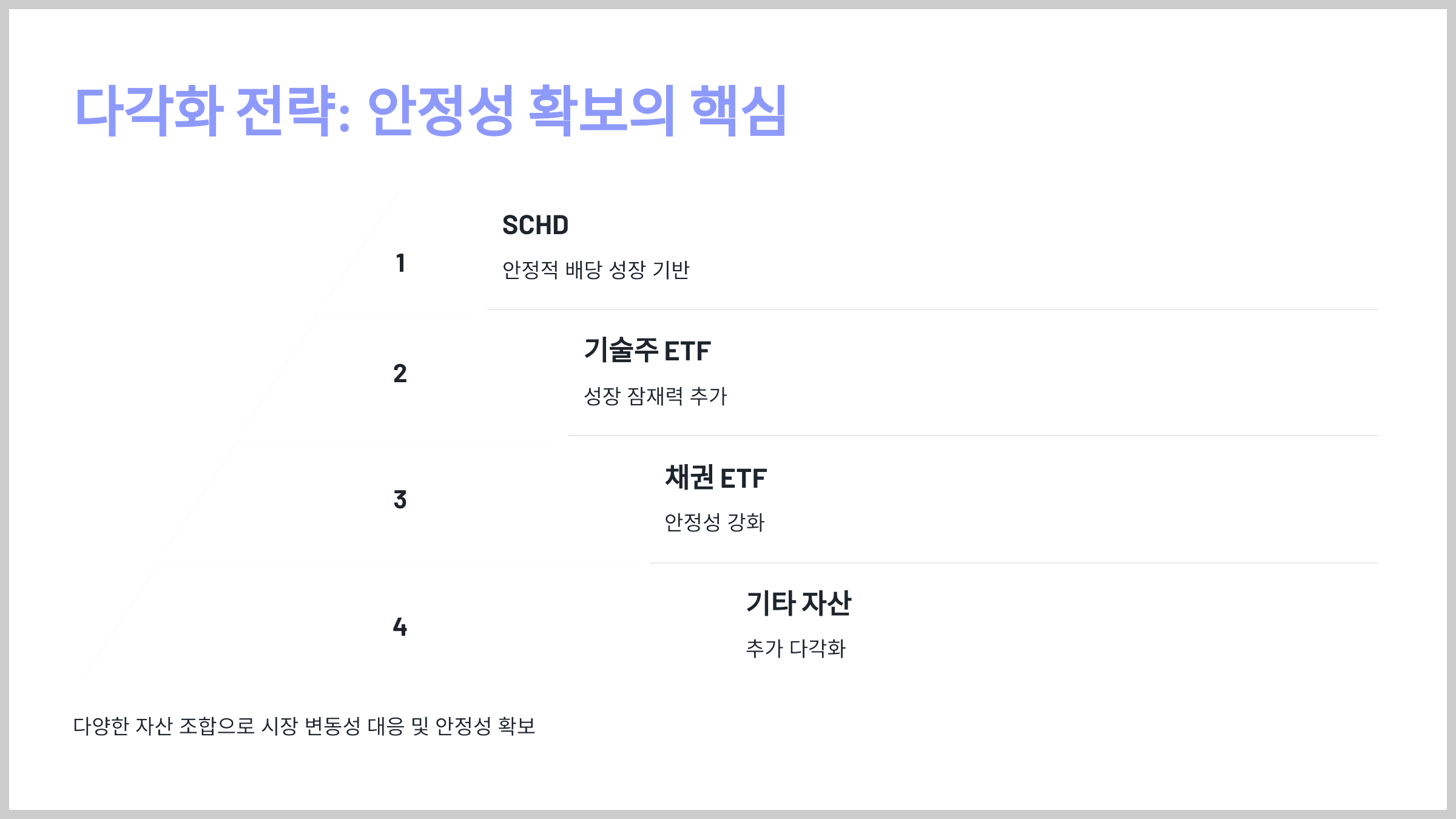 SCHD만으로 포트폴리오를 구성하는 것은 위험할 수 있습니다. 저는 SCHD와 함께 기술주 ETF, 채권 ETF 등을 조합하여 투자 포트폴리오를 구성했습니다. 이를 통해 시장 상황에 따른 변동성을 줄이고 안정성을 확보할 수 있었습니다. 예를 들어, 기술주 강세 시기에는 기술주 ETF가 SCHD의 약세를 보완해 주는 효과를 볼 수 있었습니다.