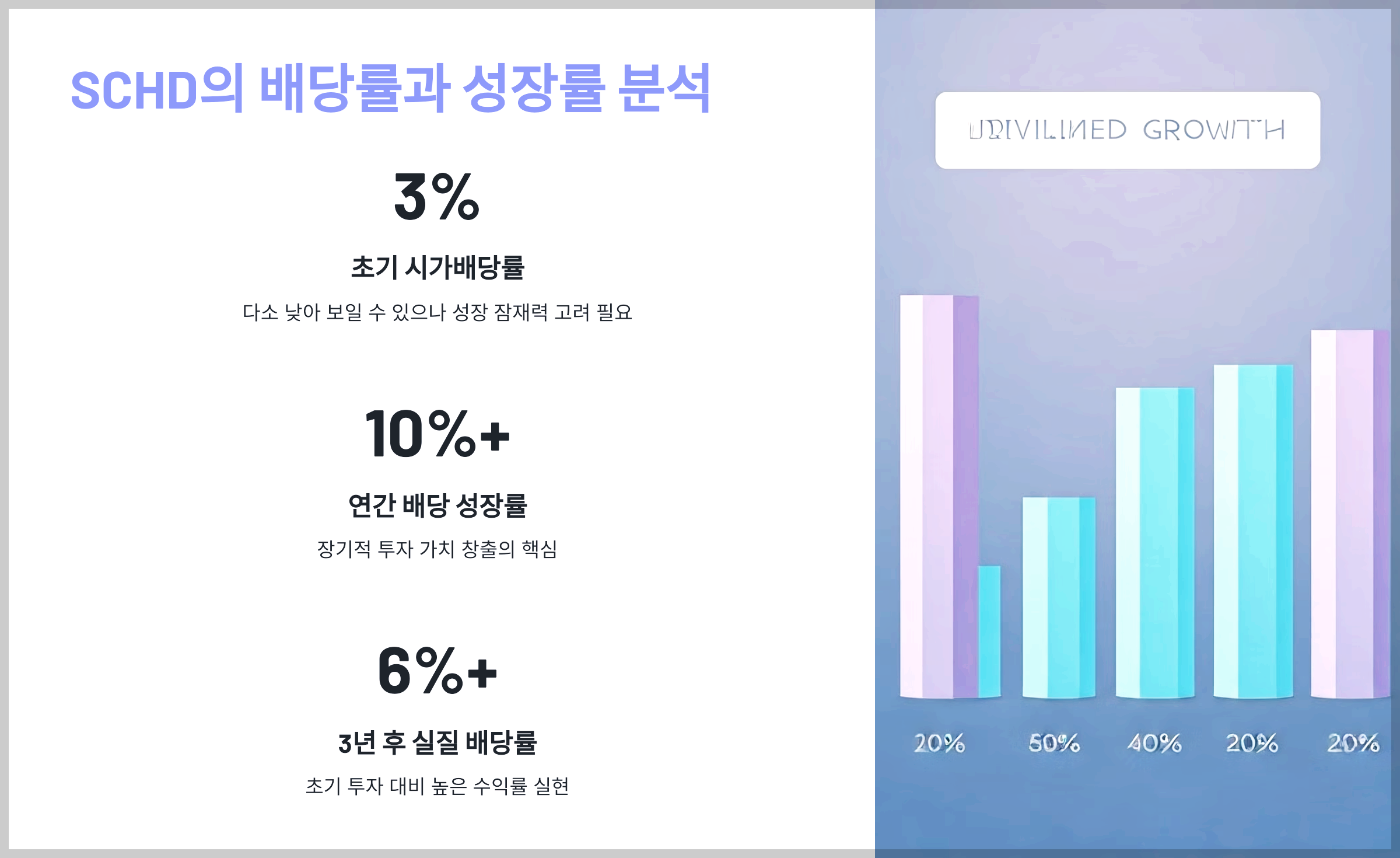 SCHD의 초기 시가배당률이 약 3%로 다소 낮아 보일 수 있지만, 높은 배당 성장률이 장기적인 투자 가치를 만듭니다. 예를 들어, 제가 3년 전 매수한 SCHD 주식의 현재 실질 배당률은 6%를 넘었습니다. 초기 배당률만 보고 실망하기보다는 배당 성장 가능성을 평가하는 것이 중요합니다.