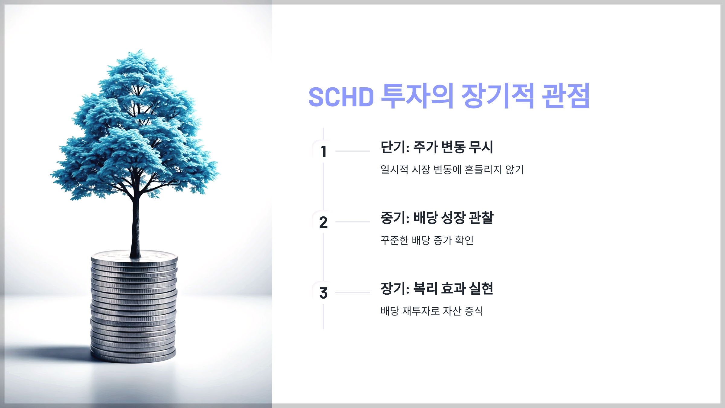 SCHD 투자의 핵심은 장기적 안목과 꾸준함입니다. 단기적인 주가 변동에 흔들리지 않고, 배당이 성장하는 모습을 믿고 기다리는 것이 중요합니다. 적립식 투자로 점진적으로 포지션을 늘려가며 복리 효과를 극대화하세요. 또한, 다양한 자산을 조합해 균형 잡힌 포트폴리오를 구성하는 것도 잊지 마세요.