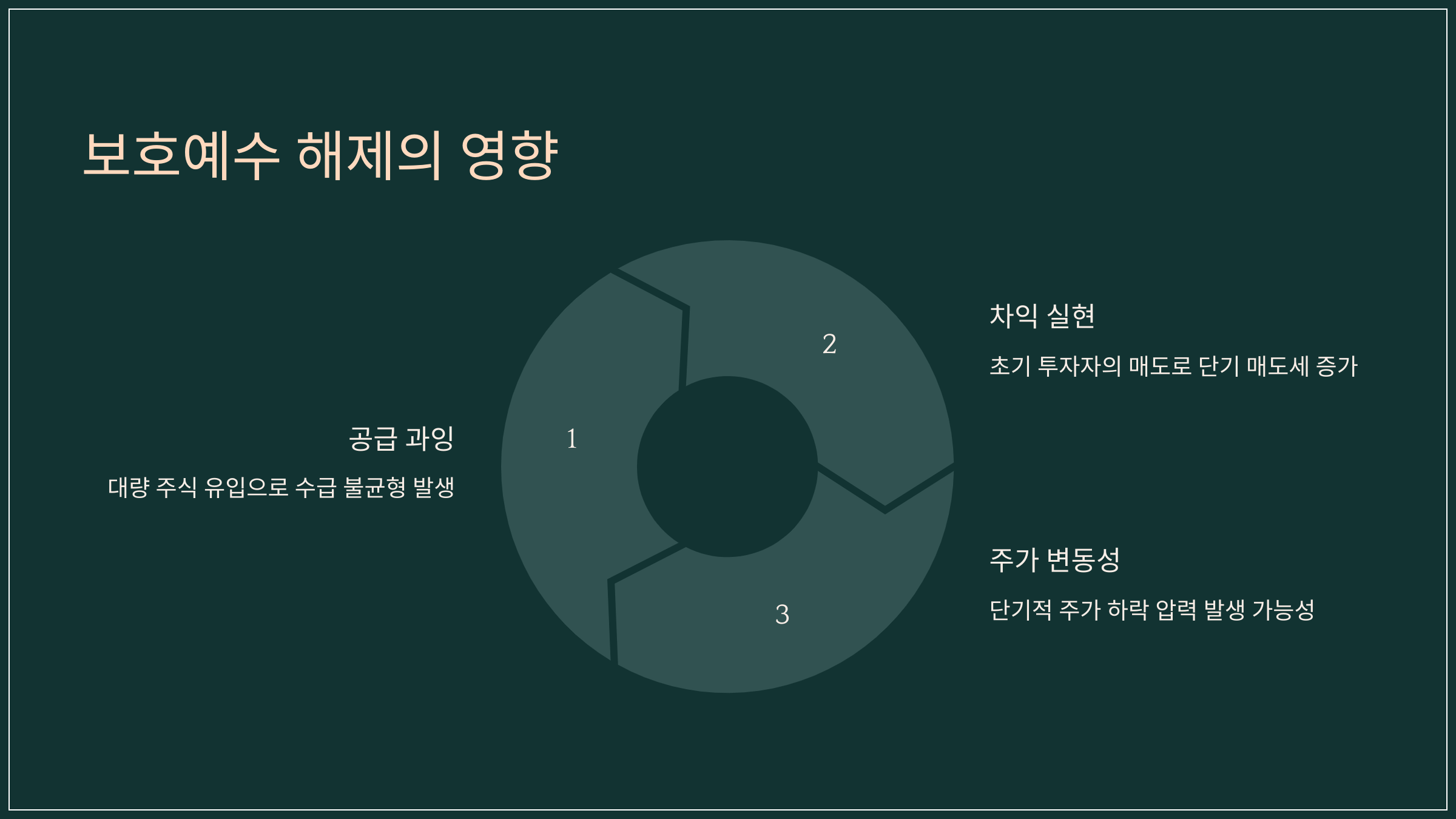 - 공급 과잉: 보호예수 해제 이후 시장에 대량의 주식이 유입될 경우 수급 불균형 발생.