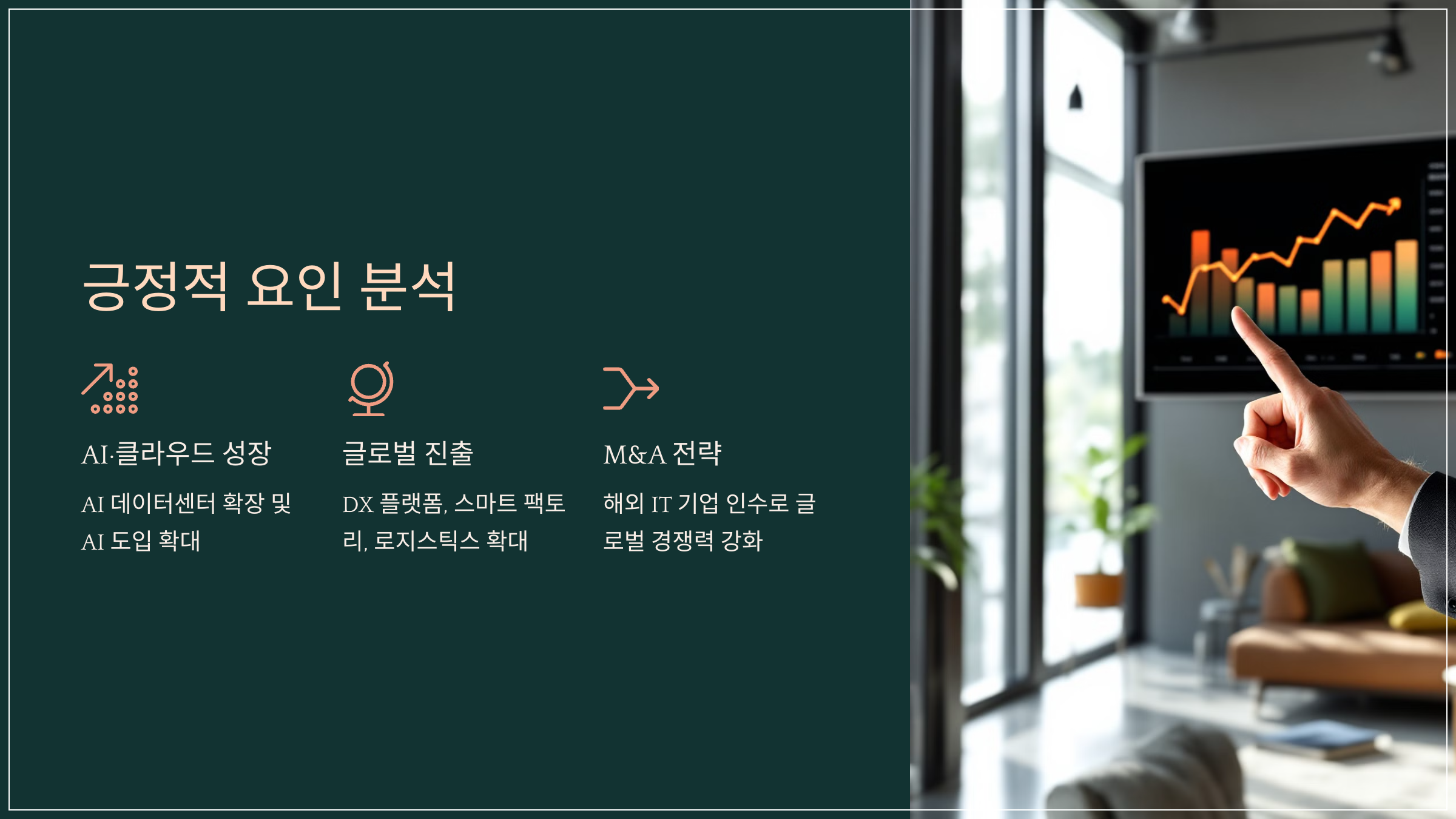 - LG CNS의 AI·클라우드 사업 성장성(연평균 25%↑) 및 글로벌 AI 기업 인수 계획을 반영한 장기 투자 가능성 검토.