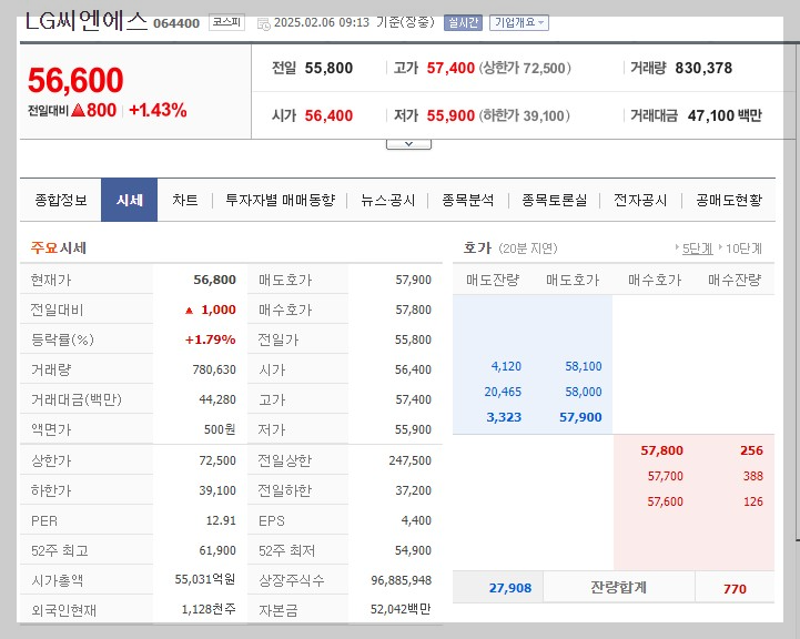 2025년 2월 5일, lg cns가 유가증권시장에 상장되었으며, 공모가 61,900원 대비 9.85% 하락한 55,800원에 거래를 마감하였다. 상장 당일 기관 투자자의 1,555억 원 순매도와 외국인 투자자의 292억 원 매도세가 주된 원인으로 작용하였다.