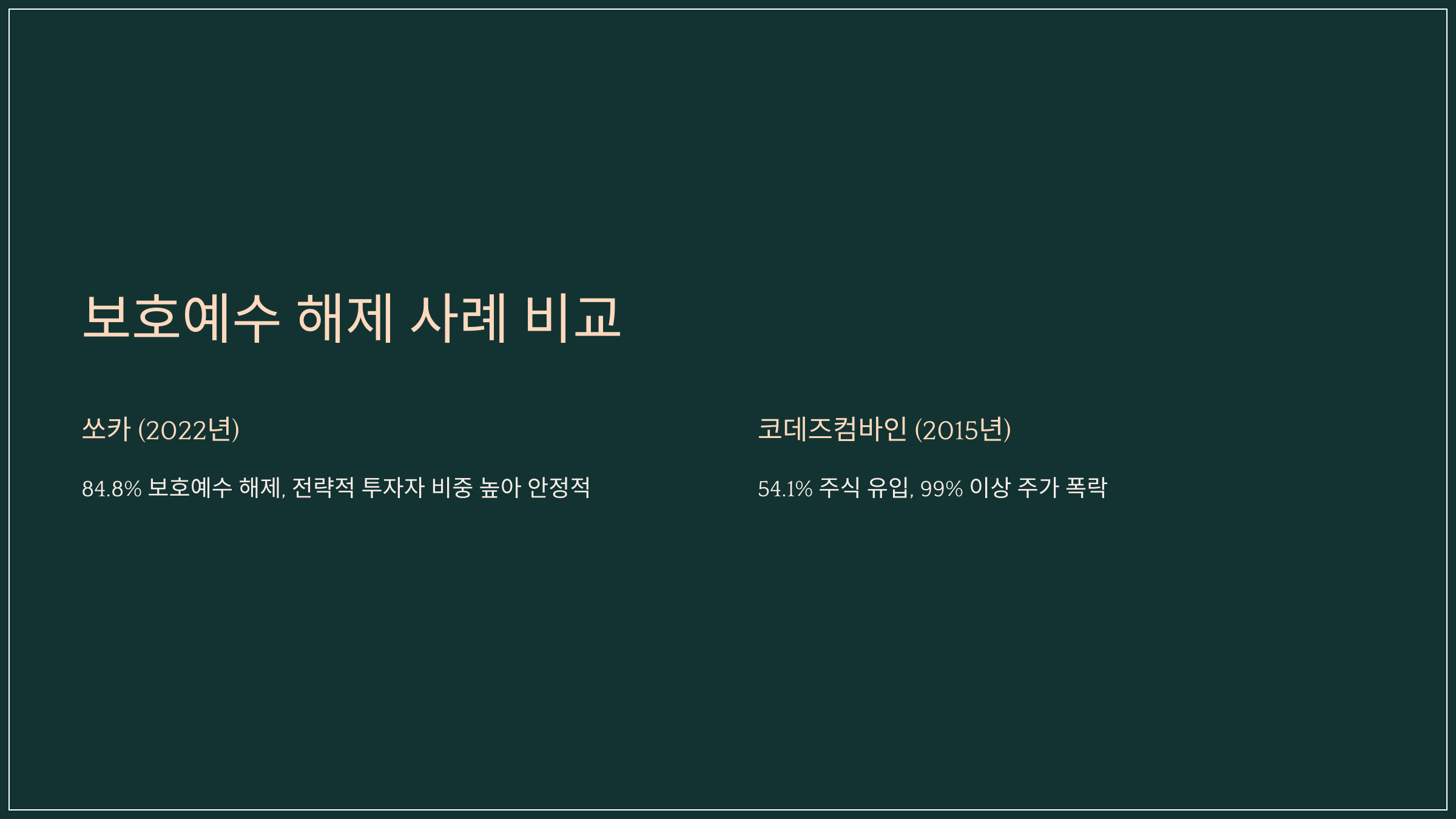 - 쏘카(2022년): 전체 상장주식 중 84.8% 보호예수 해제 → 전략적 투자자 비중이 높아 매각 가능성 낮음.
