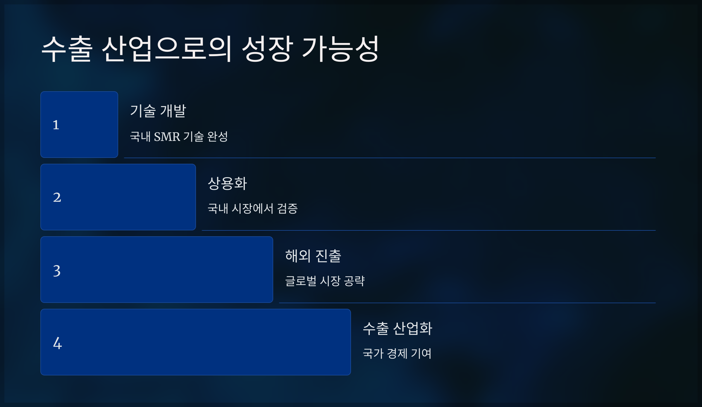 - 수출 산업으로 성장 가능성: SMR은 2040년까지 1,500억 달러 규모의 시장으로 성장할 전망이며, 수출 산업으로도 발전 가능성이 큽니다.