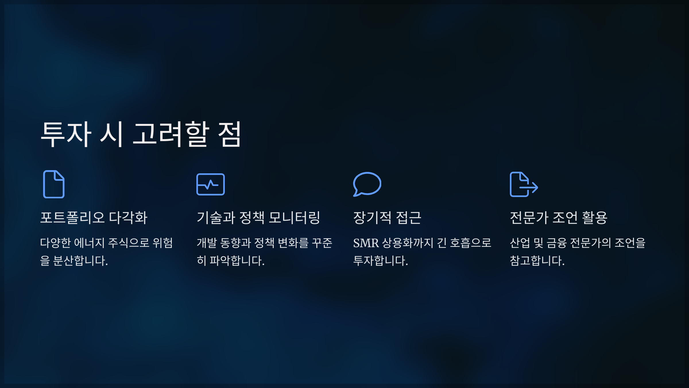 - 장기적 접근: SMR 상용화까지 시간이 필요한 만큼 긴 호흡으로 투자합니다.