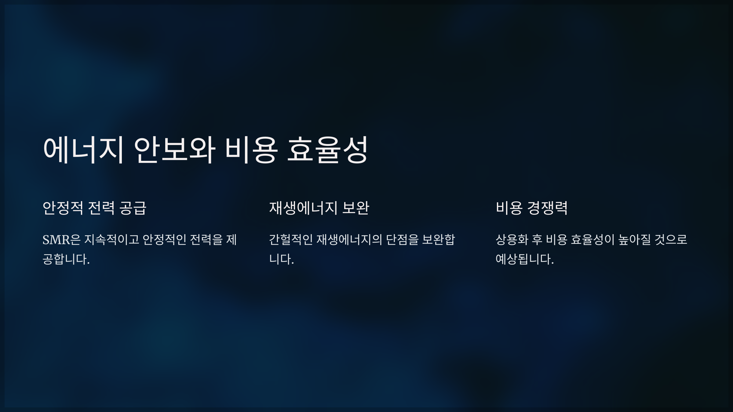 - 에너지 안보와 비용 효율성: SMR은 안정적인 전력 공급원으로 작용하며, 재생에너지의 간헐성을 보완합니다. 초기 몇 기가 상용화된 이후에는 비용 경쟁력을 확보할 가능성이 큽니다.