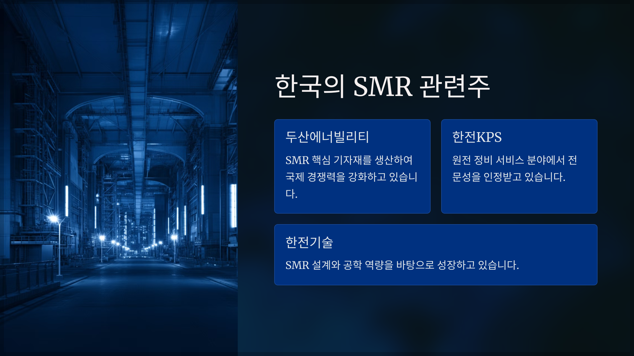 - 한전기술: SMR 설계와 공학 역량을 바탕으로 성장하고 있습니다.