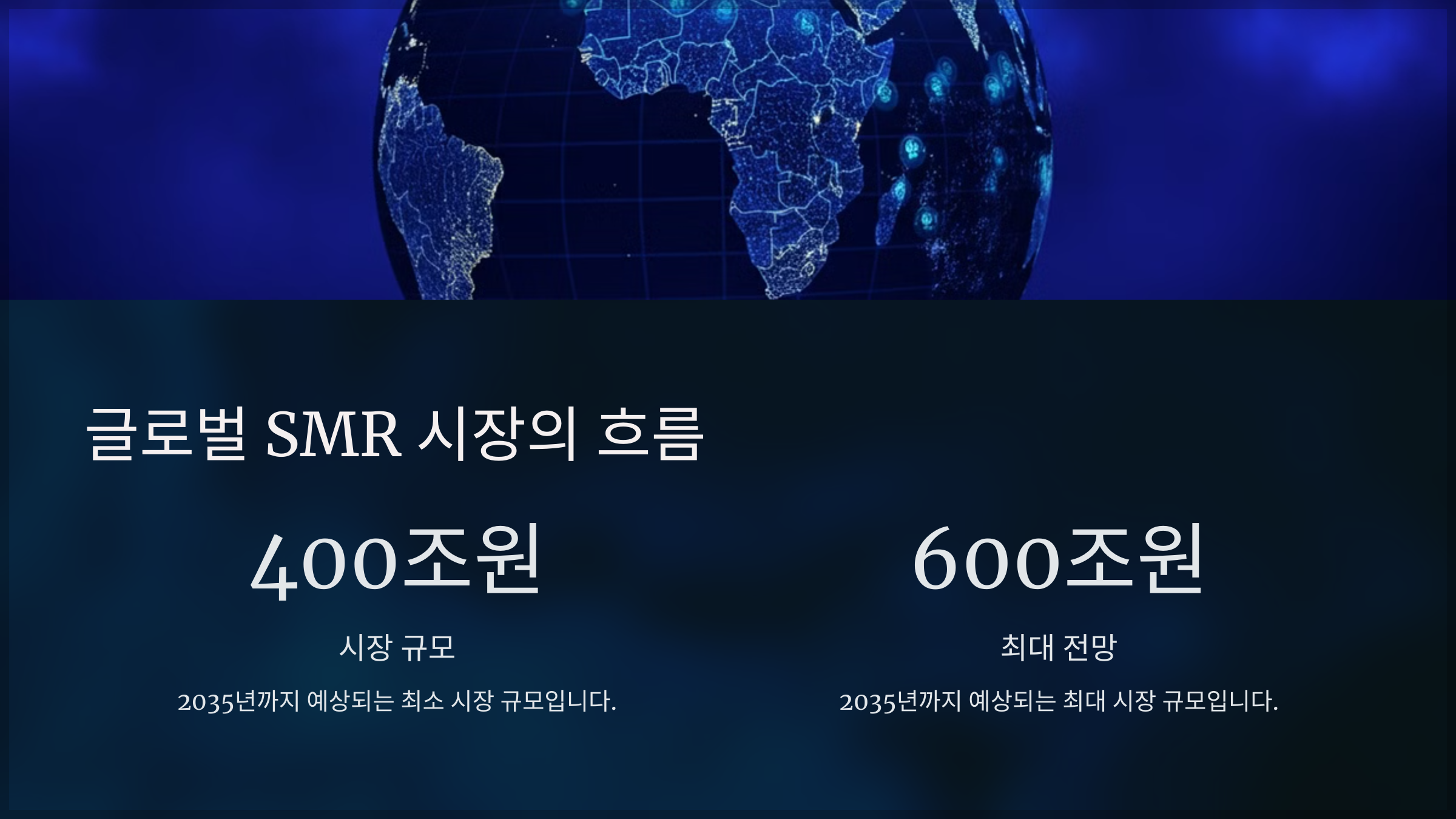 글로벌 SMR 시장은 2035년까지 400~600조 원 규모로 성장할 것으로 전망됩니다. 미국, 영국, 중국 등 주요국은 정부 지원과 민간 기술력을 결합해 개발에 박차를 가하고 있으며, 세계적 기업들이 시장 선점을 위해 활발히 움직이고 있습니다.