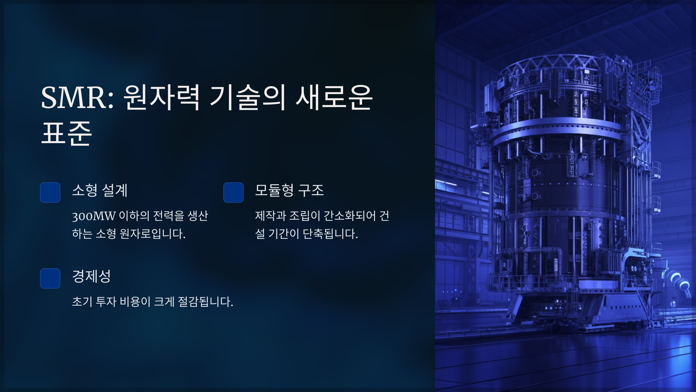 SMR은 기존의 대형 원자로와는 달리, 300MW 이하의 전력을 생산하는 소형 원자로입니다. 모듈형 설계 덕분에 제작과 조립이 간소화되어 건설 기간이 단축되고 초기 투자 비용이 크게 절감됩니다. 또한, 안전성과 유연성을 갖추고 있어 전력 생산의 새로운 패러다임을 제시합니다.
